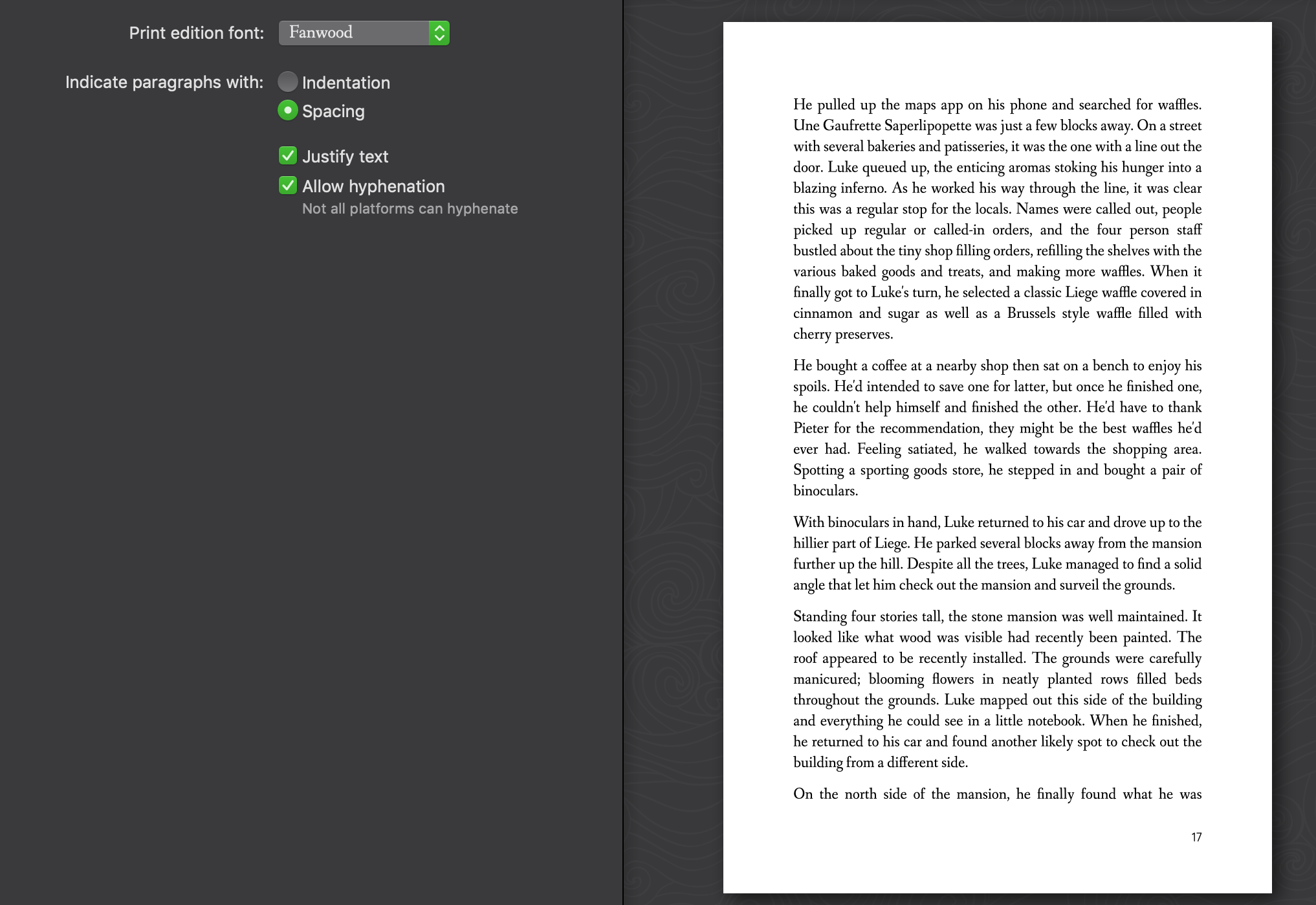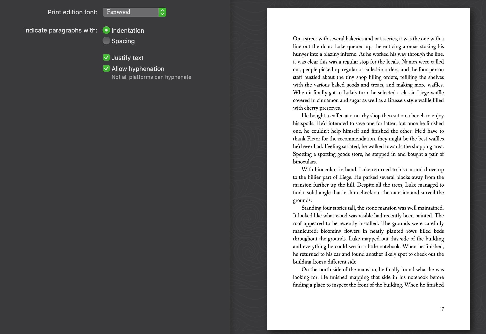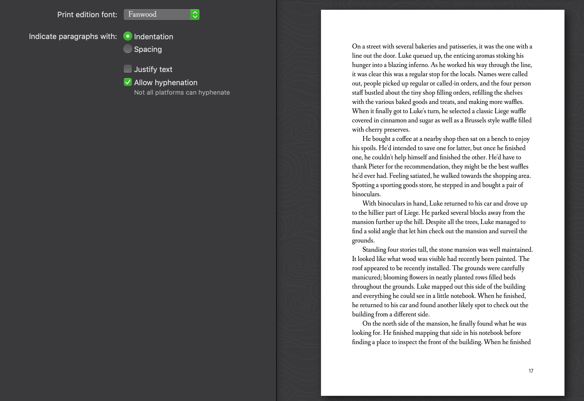 This option allows you change the look of the first line of the first paragraph of each chapter. Note – please ensure that the option you select is available for the style you selected earlier.