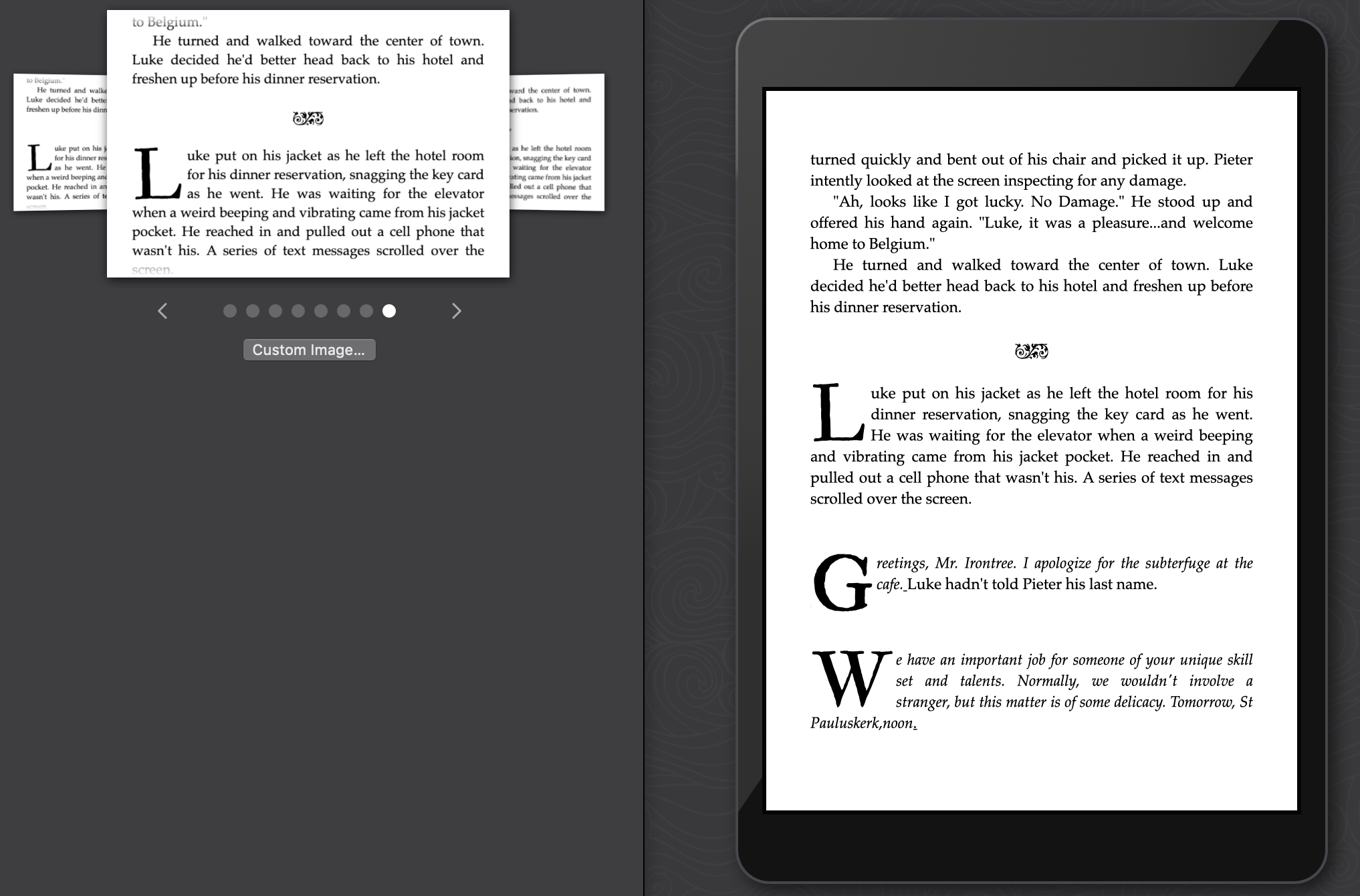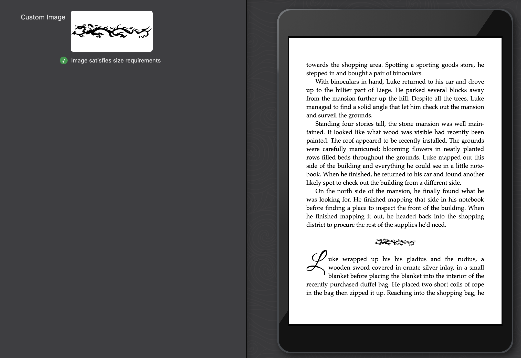Ornamental Break ten can be anything you want (within reason). A custom image can be inserted to match the theme of your book.