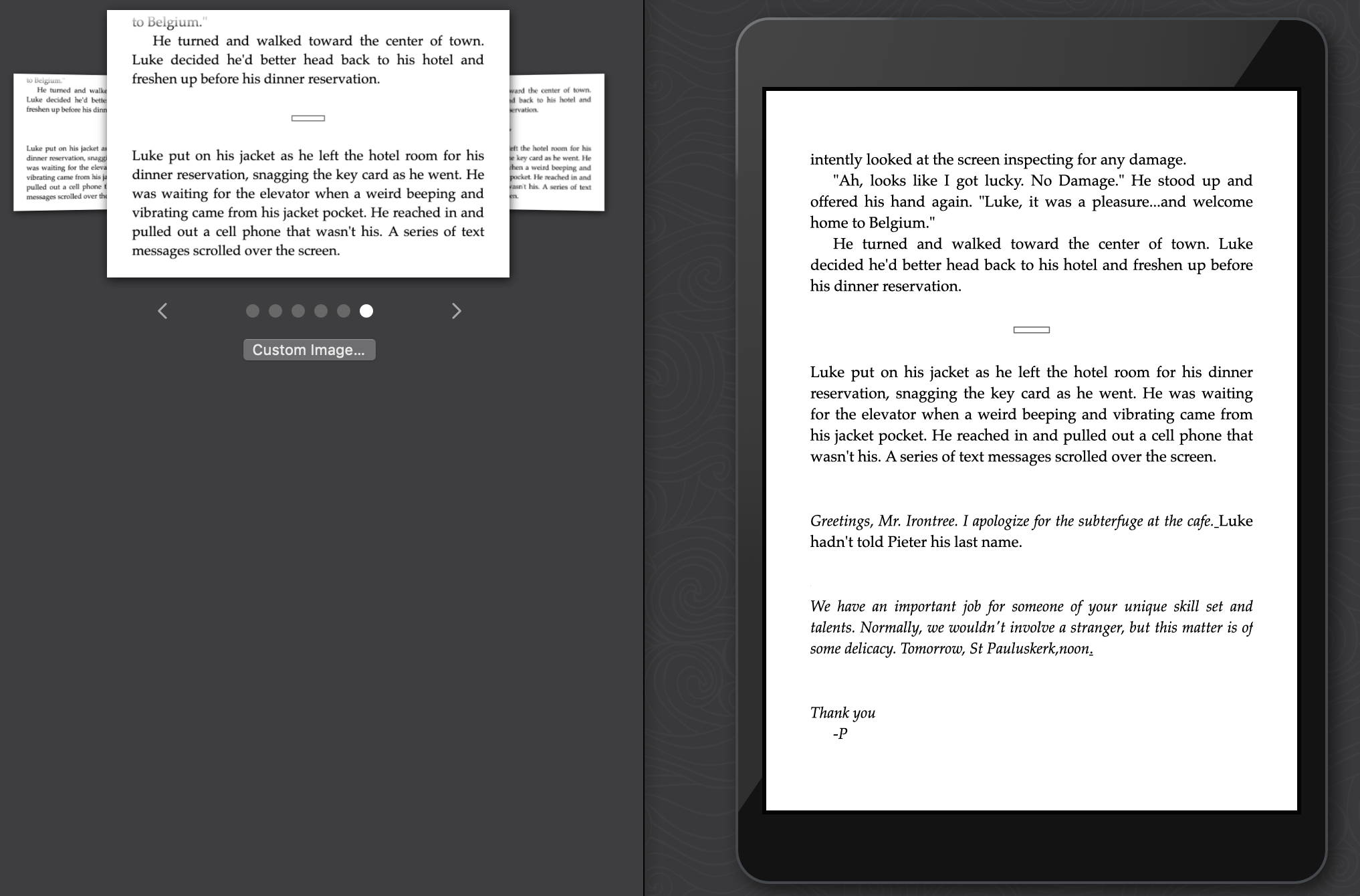 An ornamental break allows a clean visual break between sections. You can even insert a custom graphic to use as an ornamental break. A longer, shorter vector image is ideal. Note – please ensure that the option you select is available for the style you selected earlier.